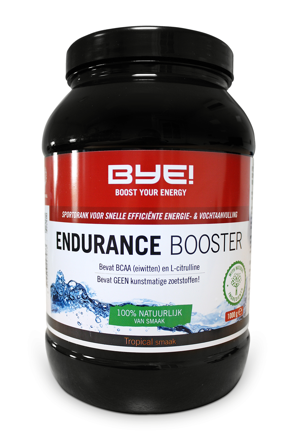De BYE! Endurance Booster bestaat voor 92 % uit hoge kwaliteit koolhydraten met aanvulling van elektrolyten en een Endurance Booster formule dat bestaat uit instant BCAA (snel opneembare eiwitten), L-glutamine, L-Taurine, L-Carnitine en L-citrulline.